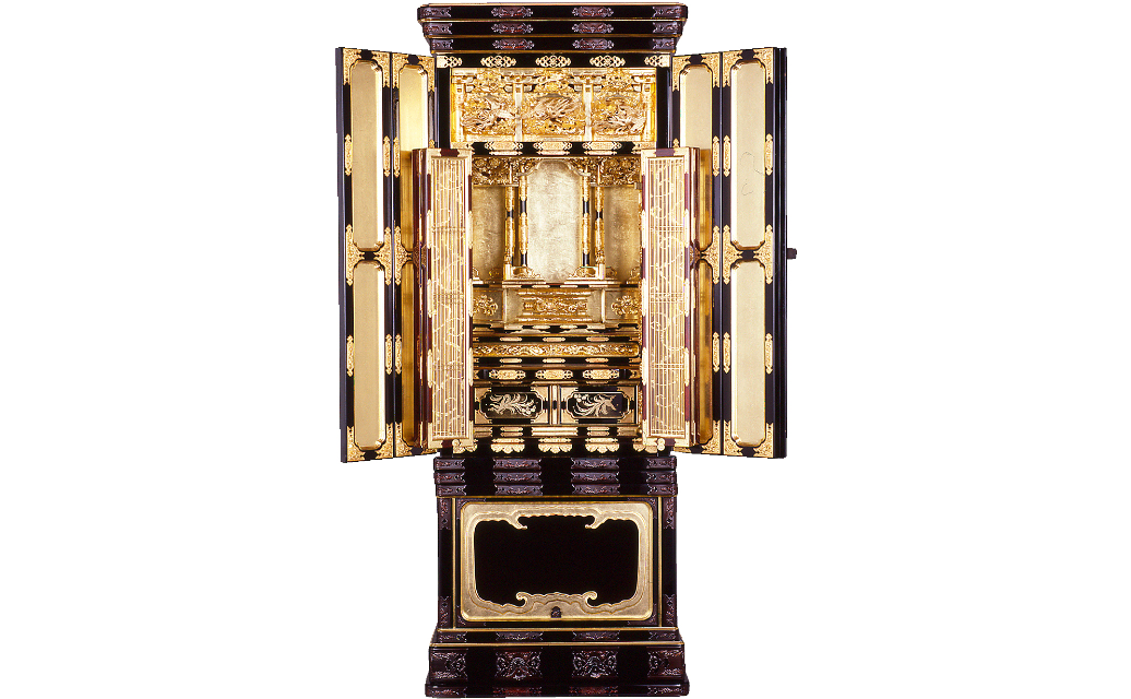 弊社謹製伝統型御坊造・檜の無垢板を豊富に使用したホゾ組木地・地域ブランド「名古屋仏壇」認定品。